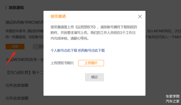 步骤4:受邀账号点击同意,根据账号主体不同下载相应附件,按要求填写后上传,通过审核后即成功加入MCN机构;