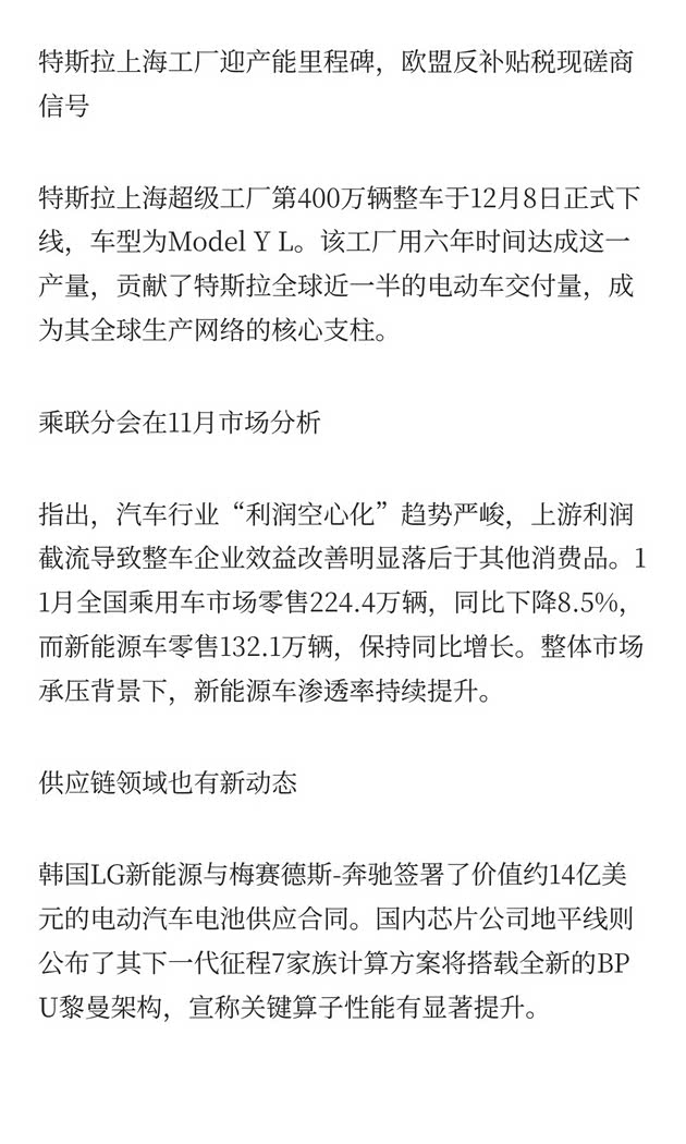 韩国LG新能源与梅赛德斯-奔驰签署了价值约14亿美元的电动汽车电池供应合同。国内芯片公司地平线则公布了其下一代征程7家族计算方案将搭载全新的BPU黎曼架构,宣称关键算子性能有显著提升。