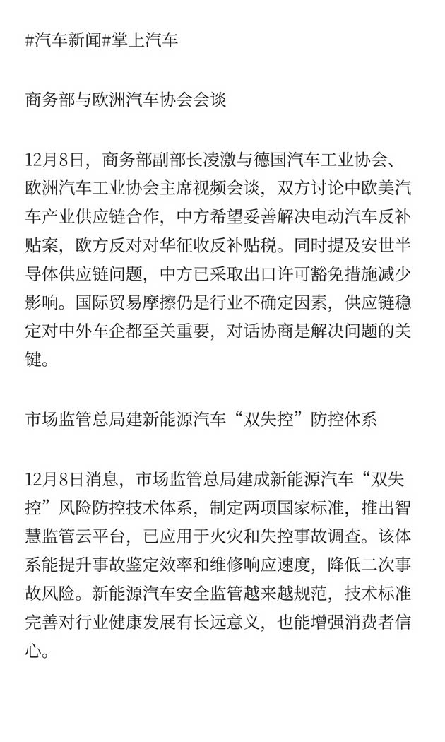 12月8日,商务部副部长凌激与德国汽车工业协会、欧洲汽车工业协会主席视频会谈,双方讨论中欧美汽车产业供应链合作,中方希望妥善解决电动汽车反补贴案,欧方反对对华征收反补贴税。同时提及安世半导体供应链问题,中方已采取出口许可豁免措施减少影响。国际贸易摩擦仍是行业不确定因素,供应链稳定对中外车企都至关重要,对话协商是解决问题的关键。