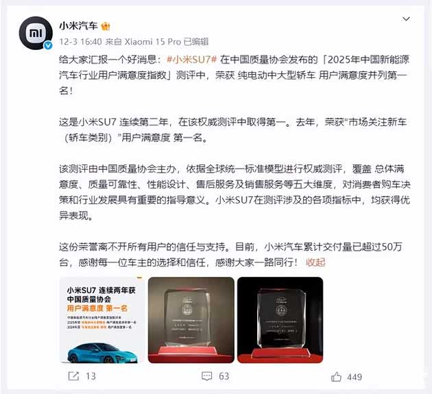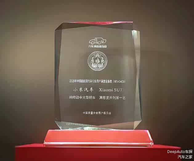 近日, 小米SU7在中国质量协会发布的「2025年中国新能源汽车行业用户满意度指数(NEV-CACSI)」测评中,荣获: