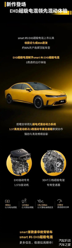 12月6日,smart宣布精灵6号亮相工信部公告,为其首款中型轿车,搭载插电式混合动力系统,全系最长轴距2926mm。从公布的信息来看,这款车尺寸很大,可以说是史上最大smart,接近5米的车长直接来到了Model 3与小米SU7的主战场。