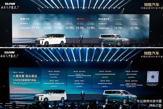 新车搭载L2级地平线智驾辅助和8155骁龙芯片智能座舱,动力系统拥有增程、纯电等多种模式。另外值得一提的是,锐胜M8还推出了8项购车权益,包括订金800元可抵扣10800元购车款;尊享车机系统5年免流量;提供整车五年或十万公里质保;首任非营运车主可免费配备充电桩并享受基础安装服务等。
