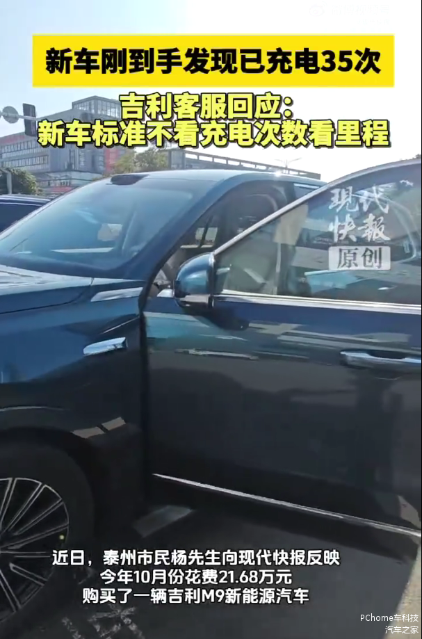 2025年12月10日,据现代快报报道,近日,江苏泰州市民杨先生向记者反映,今年10月份花费21.68万元购买了一辆吉利新能源汽车 银河M9,提车后发现该车在8月、9月两个月充电次数高达35次,车主怀疑这是一辆展车。