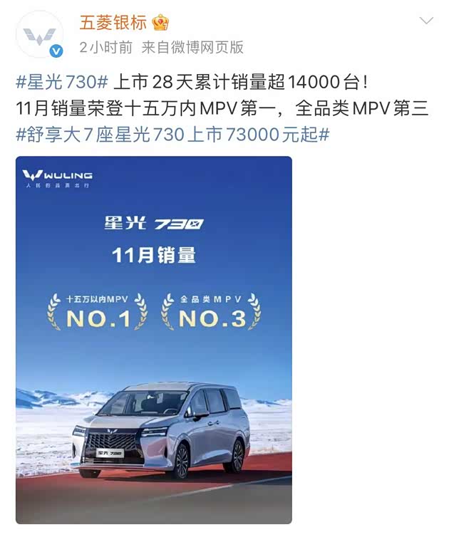 作为五菱品牌旗下的紧凑型MPV, 五菱星光730已于11月12日正式上市,提供燃油、插电混动以及纯电的动力选项,官方指导价格区间为7.30万-10.98万元。而根据官方最新发布的数据显示,五菱星光730上市28天累计销量超过14000台。