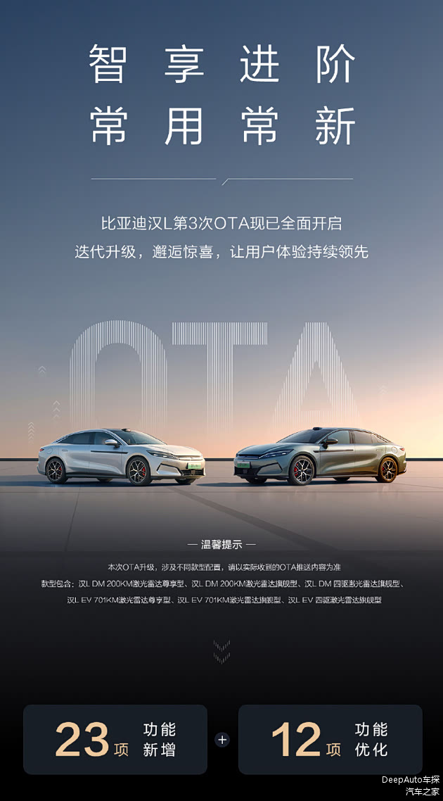 比亚迪官宣:汉L 第3次OTA全面开启
