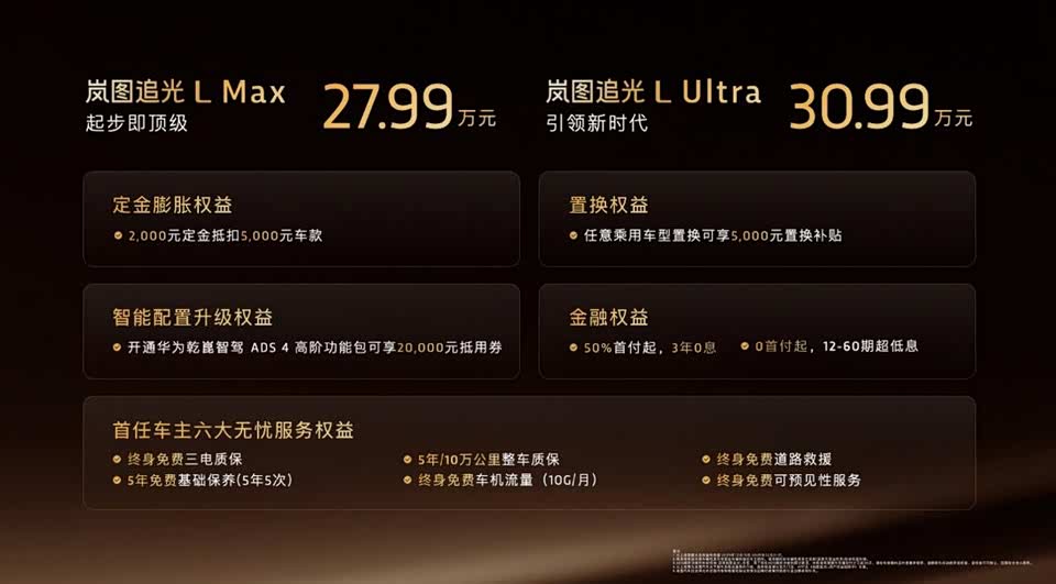 【2025压轴之作,岚图追光L上市,27.99万起】日前,岚图旗舰级轿车追光L正式上市,新车共推出两款车型,其中Max 版 27.99 万、Ultra 版 30.99 万,新车配有行业独有的 800V 超混 + 5C 超充 + 63kWh 大电池,搭配华为乾崑智驾 ADS 4 与鸿蒙座舱,并且拥有1400km 综合续航和12 分钟快充,新车作为岚图的收官之作,也将进一步充实岚图在轿车细分市场的整体实力。#岚图追光 L 上市 #