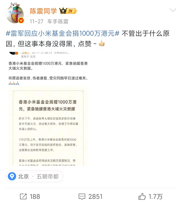随着粉丝数量越来越庞大,陈震在互联网的活跃度也越来越高,视频内容也不再局限于汽车,甚至有不少针对热门争议事件发表看法的内容。这样的内容虽然为陈震带来了巨大的流量,但也蕴藏着巨大的风险,一旦踩到监管红线,就会被禁言甚至永久封号。今年以来,陈震已经多次陷入舆论漩涡。1月因为提前泄露领克900信息赔偿了500万元;5月,小米YU7发布当天陈震在微博晒出绿色法拉利 Purosangue 照片,并配文“退一万步说,你挑哪天不好,非挑法拉利二世,皮耶罗·法拉利 老爷子 80大寿这天”,结果遭到大量网友攻击;11月,陈震评论小米向香港大埔火灾捐款1000万港元时表示“不管出于什么原因,但这事本身没得黑,点赞”,被网友质疑“阴阳怪气”。