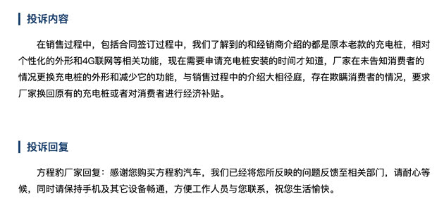 有方程豹车主投诉称,提车时4S店介绍的充电桩是老款,申请安装时才得知充电桩已换款。还有方程豹车主称,申请充电桩时与4S店确认安装的是老款充电桩,但实际安装充电桩时仍是新款充电桩。
