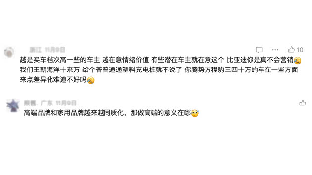 有网友称方程豹属于比亚迪旗下的高端个性化品牌,个性化品牌就应该有个性化配置,不应该统一造型。当然,更多车主异口同声地吐槽方程豹新款充电桩减配。