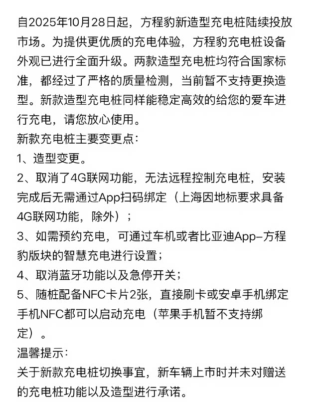 另外,方程豹新款充电桩的功能进行了大幅度调整:4G联网功能被取消,仅上海因地方标准而保留该配置;两张NFC卡片代替了蓝牙功能与急停开关。由于4G联网功能被“阉割”,老款充电桩的预约充电功能被取消,方程豹官方称新款充电桩无法远程控制,需要通过车机或比亚迪App设置。