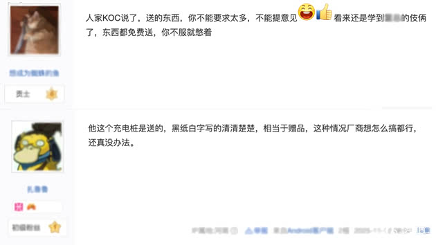 部分网友称充电桩属于赠品,厂家可以自行变动,消费者只能自认倒霉。