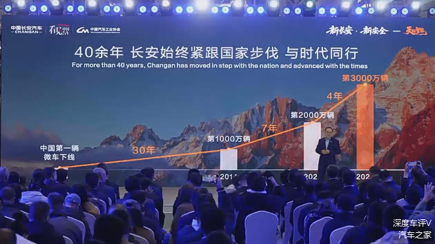 这一跨越是中国长安发展史上的重要里程碑,也印证了企业数十年的发展积淀。1984年,长安汽车响应“军转民”号召实现第一辆微车下线,开启首次创业;2003年,启动“商转乘”第二次创业,首款全球战略车型第一代逸动上市首年销量即突破10万。2017年,以创新创业计划拉开第三次创业帷幕,明确向智能低碳出行科技公司转型。三次关键转型持续为发展注入动力,2014年达成首个1000万辆耗时30年,2021年突破2000万辆的时间缩短至7年,此次跨越第三个1000万辆仅用4年半。