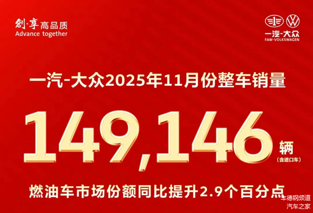 2025年11月中国车市寒意渐浓,根据乘联分会的数据显示,11月国内乘用车零售同比下滑8.1%,燃油车市场更是遭遇22%的同比下滑。但在这样的弱市环境中,一汽-大众交出了一份亮眼答卷:11月销量149146辆,环比10月增长7.4%,旗下大众、奥迪、捷达三大品牌燃油车市场份额全部实现同比正增长,燃油车整体份额同比提升2.9个百分点。这份成绩单不仅逆势领跑合资品牌,更揭示了车市转型期的生存密码。