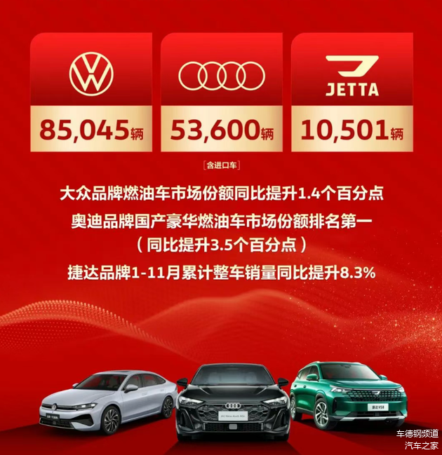 在新能源渗透率已达59.3%的当下,一汽-大众燃油车的强势表现堪称行业奇观。大众品牌以85045辆销量成为中坚力量,燃油车份额提升1.4个百分点;奥迪品牌销量为53600辆,国产豪华燃油车市场份额稳居第一,同比提升3.5个百分点;捷达品牌销量是10501辆,1-11月累计增长8.3%,持续夯实经济型燃油车市场。