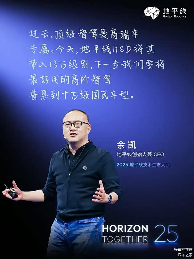 在这样的背景下,有一家供应商正试图把好用的城区NOA“拉低身段”,带到十万级国民车上。在12月8日举办的2025地平线技术生态大会上,地平线创始人兼CEO余凯表示,一定要把最好用的城区辅助驾驶,杀到10万元级的国民车型。