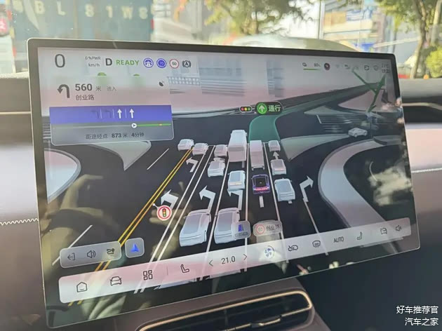 但正是这种“无戏剧性”,构成了HSD在这次体验中的一个鲜明特点。除了起步驶离停车场、结束前驶回停车场这两个阶段之外,全程笔者只在一次斑马线前轻踩过加速踏板——在确认安全的前提下,让车辆更干脆地通过人行横道,避免“拖在中间”影响后方车流。其余时间,驾驶权都交在系统手里。