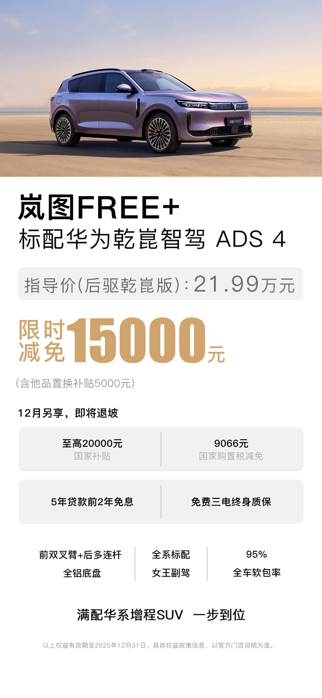 12月5日,岚图汽车在武汉宣布,针对旗下SUV车型 岚图FREE+推出限时购车政策:即日起至指定日期,消费者可享受15000元尾款减免(含置换补贴),并继续保持“入门即满配”的配置策略。该政策被业内视为车企对即将实施的新能源汽车购置税政策调整的提前应对。