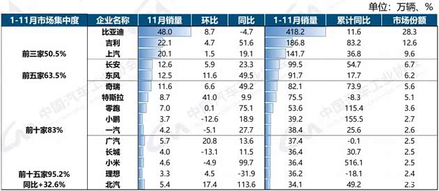 重点企业集团销量方面,1-11月新能源汽车销量排名前十五位的企业集团销量合计为1407.2万辆,同比增长32.6%,占新能源汽车销售总量的95.2%,高于上年同期1个百分点。