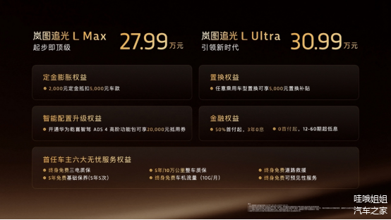 【2025年12月10日 北京】12月10日,新时代旗舰轿车——岚图追光L正式上市,共推出2款版型,售价分别为Max版27.99万元、Ultra版30.99万元。新车同步推出总价值5.2万元的终身免费三电质保、五年免费基础保养等首任车主六大无忧服务权益。