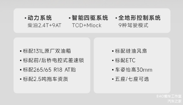 官方数据显示,新车搭载131L双油箱设计,配合高效动力总成实现满油1400公里续航,恰好覆盖拉萨至墨脱的全程无补给穿越,彻底解决了无人区续航焦虑。更难得的是,这套双油箱采用双油泵独立工作模式,搭配高强度车身与车架,在保障续航的同时筑牢安全防线。在通过性方面,新车车高升高30mm,最小离地间隙提升11mm,接近角与通过角同步优化,标配265/65 R18规格AT胎,胎面更厚、花纹更深,再加上新增的岩石模式与专家模式,使驾驶模式扩充至9种,无论是越野新手还是资深玩家,都能从容应对碎石路、陡坡等复杂路况。