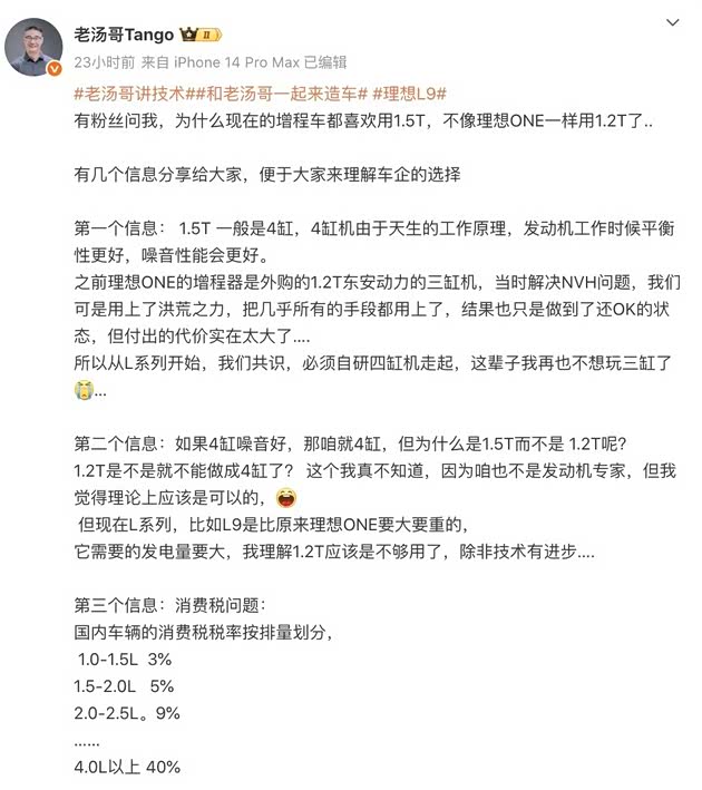 不过,汤靖突然谈这个增程器的问题,也被认为是在给新款L9“吹风”。这条帖子中,汤靖还加了#理想L9#的话题。有人猜测,汤靖是在明示下一代L系列会继续使用1.5T增程器(会优化得更好),然后上更大的电池(增加100公里左右续航)。还有猜测,L9大改款会上2.0T的增程器。
