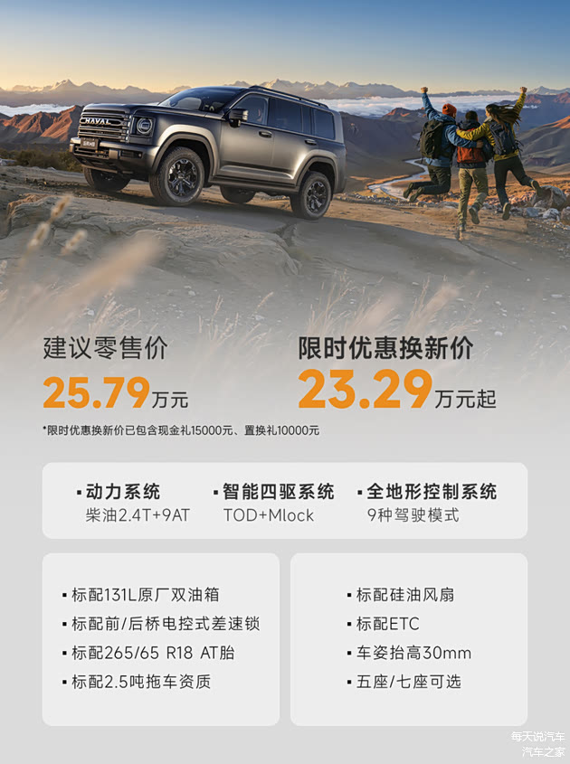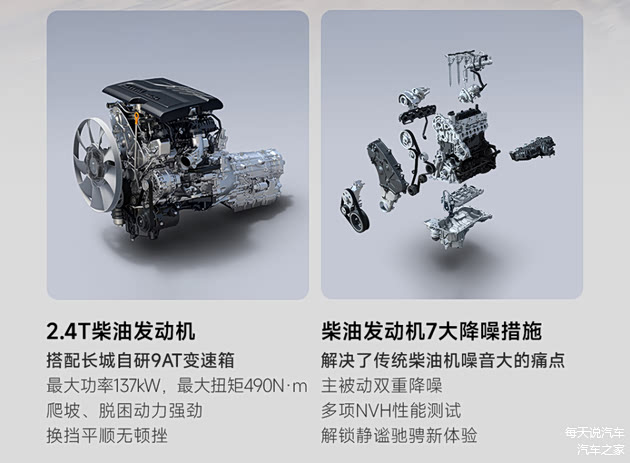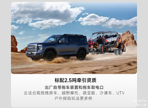 动力方面,哈弗H9穿越版将搭载一台2.4T柴油发动机,其最大功率为137kW,峰值扭矩为490N.m,传动方面匹配一台9AT变速箱,并标配硅油风扇,新车可提供适时四驱以及前后桥差速锁,另外还将搭载总容量为131L的双油箱,其WLTC续航里程可达1400公里,并标配2.5吨牵引资质。