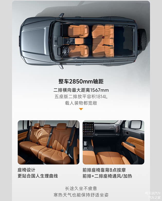 内饰部分,新车在布局上没有太多变化,采用了黑棕撞色布局,线条平直硬朗,车内配备了三辐式多功能方向盘、14.6英寸悬浮式中控屏,并在中控屏下方和中央通道还保留了大量实体按键可以方便在越野时进行操作,配置方面,新车将配备前排座椅通风/加热、无钥匙进入、无线充电面板、驾驶模式选择、坦克掉头、四驱模式选择、前后桥差速锁、语音识别、全景融合泊车、L2级驾驶辅助系统等功能。