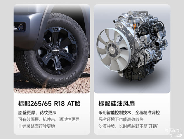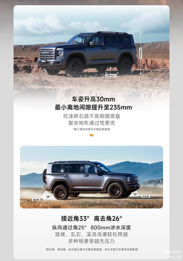 车身侧面同样是富有力量感的硬派越野造型,同时硬朗的腰线贯穿整个车身,线条凹凸有致。城垛式的大轮拱设计,与车身硬派造型相呼应,尾部也依旧是一副标准的硬派越野车的模样,并搭载了黑色轮毂,配备的外挂式备胎+纵向分布的尾灯组依旧最为抢眼,后备厢门也延续了侧开式的设计,新车搭载了6辐式的黑色轮圈以及标配AT越野轮胎,新车高度增加30mm,车身宽度增加16mm,空载离去角26度,空载接近角由31度提升至33度,空载最小离地间隙提升11mm至235mm。