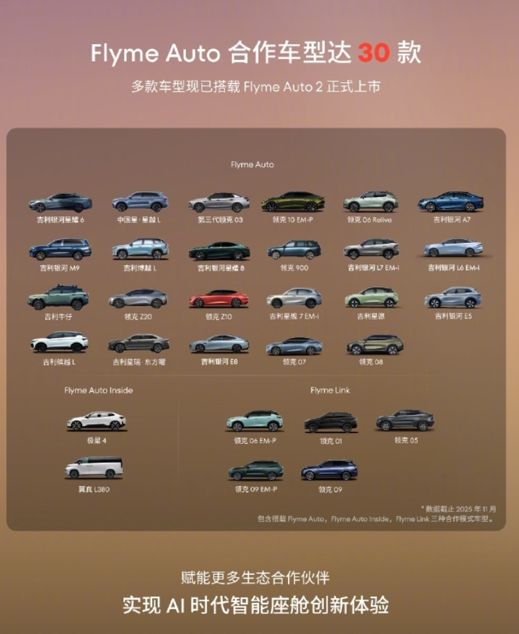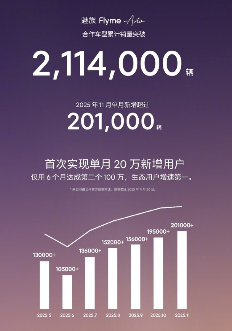 魅族科技发战报,Flyme Auto 11月新增用户超20万,合作车型总销量超211万,持续刷新好成绩,Flyme Auto合作车型已经有30款,主打一个搭载数量多,覆盖车型广。您最喜欢的座舱系统是什么,评论区聊聊。