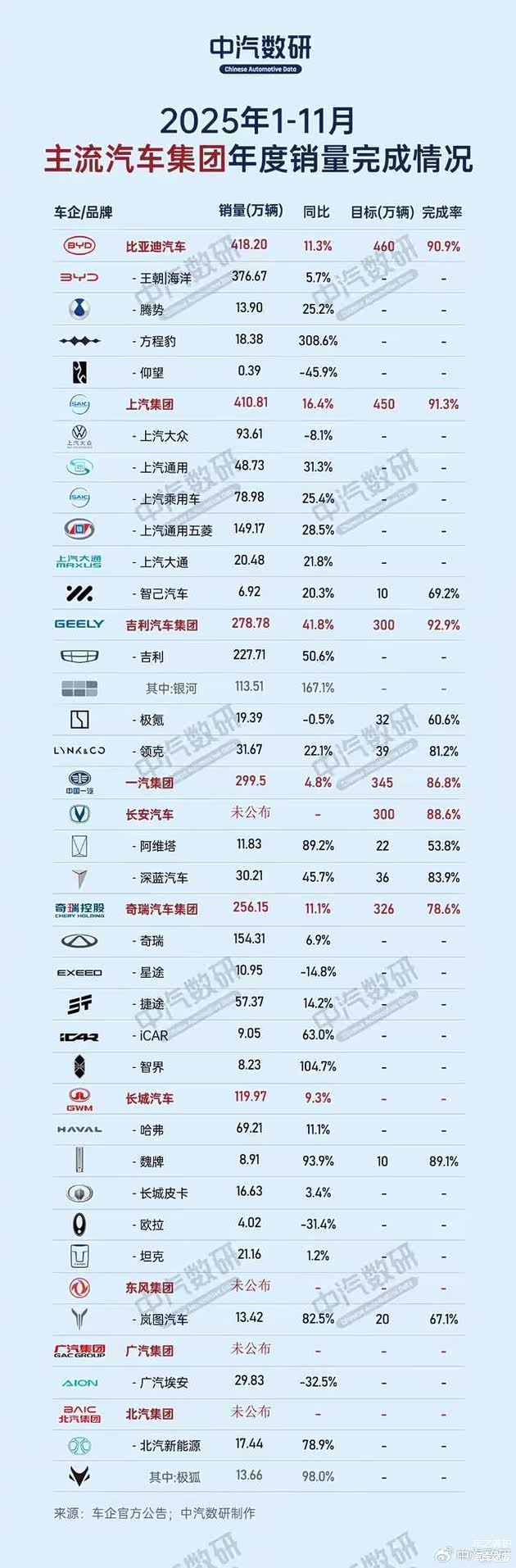 随着年末临近,2025年中国车市的整体格局已趋于明朗。根据中国汽车工业协会及第三方研究机构发布的数据,2025年1至11月,中国汽车市场在激烈的竞争与结构性调整中继续前行,各大主流汽车集团的目标完成率也在近期公布,接下来我们来看看这些集团的销量表现及其旗下主流车型的销量表现。