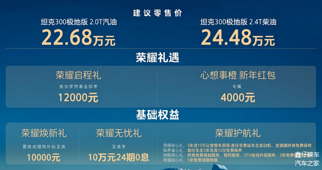 坦克300极地版通过限量发售、专属拉花及徽章、冰雪场景配置升级、动力系统匹配和四驱性能优化,形成了对特定使用场景的针对性方案。对于冰雪地区用户、越野爱好者或特殊用途车辆需求者而言,极地版在实际驾驶操作和场景适应性上提供了更直接的使用价值。柴油版和汽油版的选择,使车辆在低温牵引与城市巡航之间提供平衡方案,同时限量发售增加了购买决策的确定性和识别度。整体来看,坦克300极地版兼顾功能性、场景适应性与用户操作便利,为潜在购买者提供了明确导购参考。