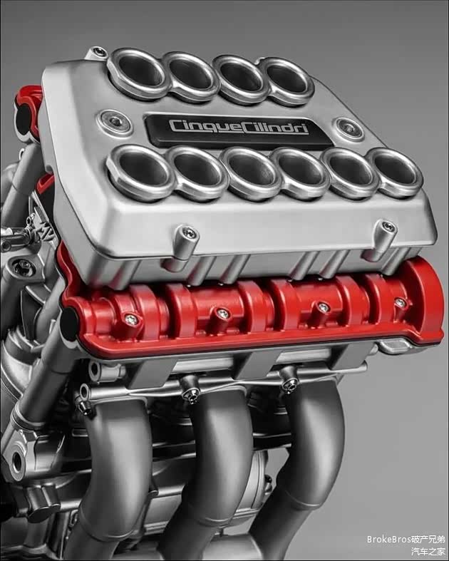 与本田5缸的V形排列方式不同,奥古斯塔的5个气缸是U形排列。从缸头角度观察,5缸并列排布呈奥运五环式的布局,它们之间没有形成任何夹角,因此不能共用同一根曲轴,而是前三缸一根曲轴,后两缸另一根曲轴的结构,两根曲轴通过齿轮耦合同步,配合动力汇流机构实现统一输出。