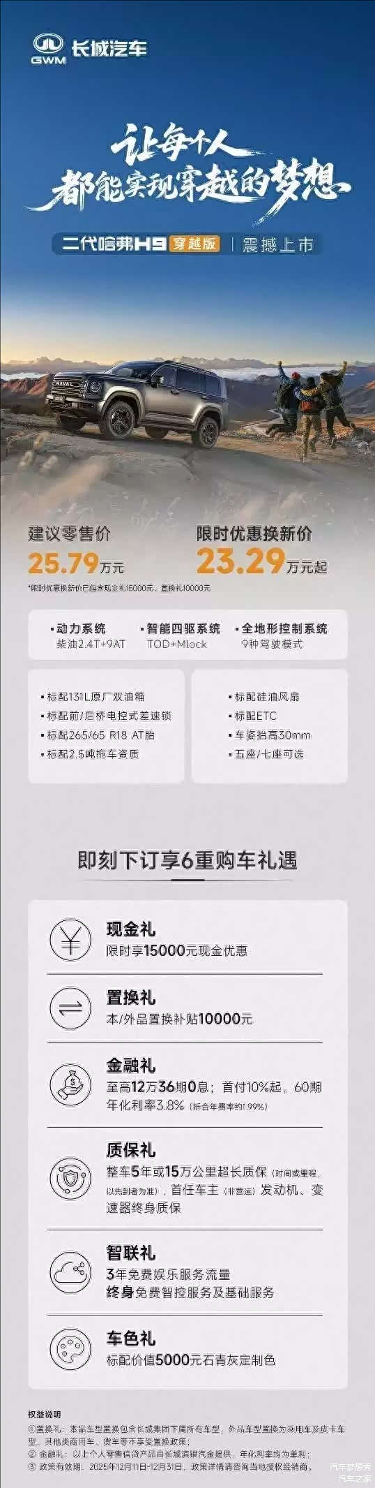 2025年12月11日,哈弗品牌正式发布二代哈弗H9穿越版,官方指导价25.79万元,限时优惠换新价23.29万元起。新车以“让每个人都能实现穿越梦想”为核心定位,针对长途越野场景进行系统性原厂强化,通过双油箱设计、专业越野配置及舒适性升级,成为20万级硬派SUV市场的颠覆者。
