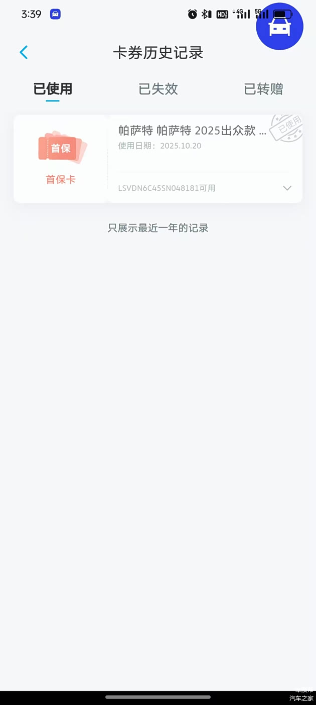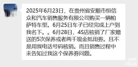 据车主描述,2025年6月23日,其在该4S店购置了一辆帕萨特车型,6月25日该车已完成上户手续,正式登记至其名下。然而,6月28日,车主意外发现,厂家为该车型赠送的5次保养或两千元现金抵用券已被4S店核销,且核销操作并非使用车主本人的电话号码。