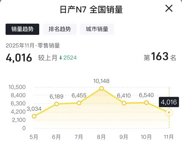 但与光鲜的产能数据形成强烈反差的是,日产 N7 的市场销量正急速降温。8 月创下超万辆的销量峰值后,其销量便开启逐月下滑模式:10 月销量 6540 辆,11 月直接跌至 4016 辆,环比暴跌 39.4%,半年后的市场表现已然承压。