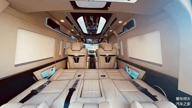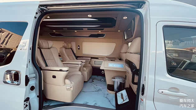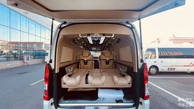 打开掀背式尾门后,可见两个白色/米色吊装座椅呈“悬挂状态”收起于车顶两侧,后备箱空旷平整,可轻松容纳多个行李箱或改装为临时储物区。全黑外观 + 棕咖内饰高端商务接待:航空座椅+影音系统,打造移动会议家庭长途出行。
