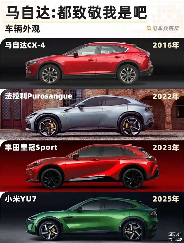 这些词单拎出来你可能没啥感觉,但放到一张图上,再对着小米YU7看一眼,就大概知道为啥评论区会刷屏“撞脸”了。