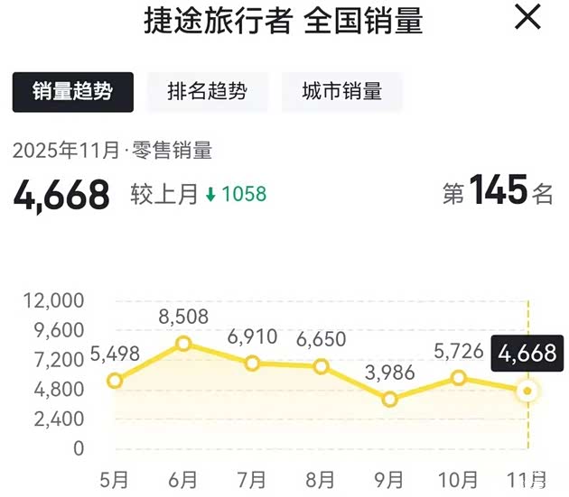 而作为国内市场是销量最快突破20万辆的方盒子SUV车型。捷途旅行者在今年11月份的销量为4668辆,相比去年同期销量10682辆,同比下滑56.3%,同时捷途旅行者相比今年10月份的销量5726辆,环比下滑18.47%。