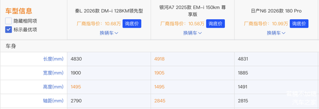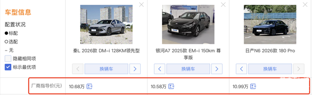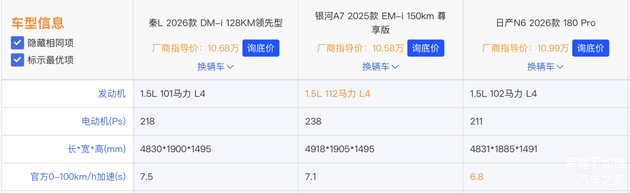 对于广大消费者来说,买车首要考虑因素就是预算,我们以10万元预算为基础,选出最符合该预算的三款具体车型。经过对比发现,笔者选择指导价为10.68万元的秦L 2026款DM-i128公里领先型、指导价为10.58万元的2025款银河A7 150公里尊享版和指导价为10.99万元的180公里Pro版。三款车价格都在10到11万元,价格非常接近且都是各自车系的中配主销版本,因此选择以上车型对比,用价格为标准,尽可能地体现公平。