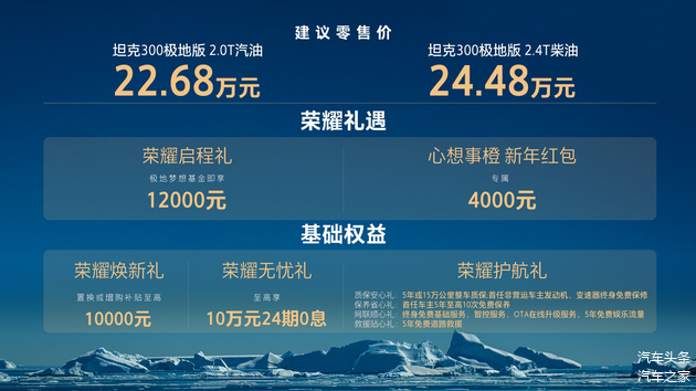 2025年12月11日,在坦克300全球用户达成50万之际,坦克300极地版正式上市。官方建议零售价,坦克300极地版2.0T汽油22.68万元,坦克300极地版2.4T柴油24.48万元,并推出荣耀启程礼、心想事橙新年红包和多项基础权益等多重购车礼遇。