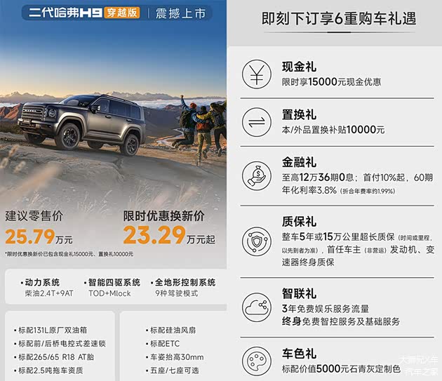 12月11日,二代哈弗H9穿越版以23.29万元的限时优惠价正式上市。这个价格直接瞄准了硬派越野市场中长期被合资品牌垄断的领域,让注重实用性的消费者找到了新的选择。目前订购还能享受现金礼、置换礼等多重权益,进一步降低了入手门槛。