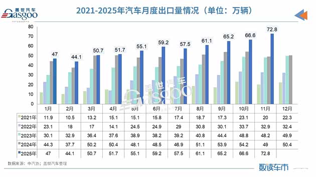 2025年11月,我国汽车出口实现历史性跨越,单月出口量首次突破70万辆,达到72.8万辆,环比增长9.3%,同比大幅增长48.5%,展现出强劲的出海势头。
