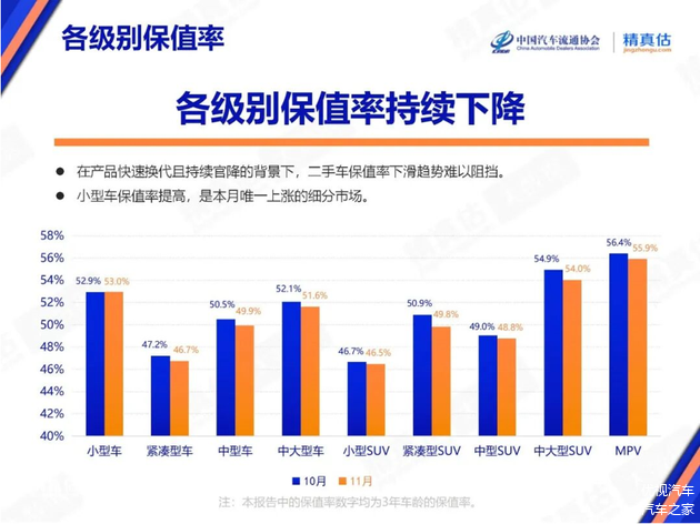 这不是个例。中国汽车流通协会11月最新的保值率报告显示:各级别乘用车的保值率都在持续下降。