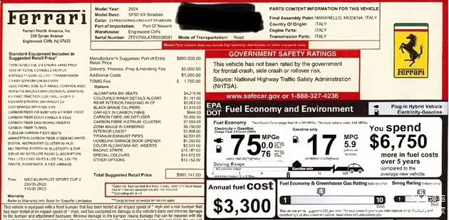让人疑惑的是,尽管转手如此频繁,这台SF90 XX Stradale的车况却堪称“完美”。CARFAX报告显示,它无事故、无损伤、无产权纠纷,里程表也无异常,完全符合“准新车”标准。而这样的“干净履历”,正是炒家敢于频繁倒手的核心底气——限量超跑的价值核心在于“稀缺性+完好度”,只要车况没问题,哪怕转手次数多,也能持续溢价。其原始MSRP仅98.1147万美元(含选装及手续费),短短15个月溢价超71万美元,收益率高达72%,远超多数理财产品,也难怪炒家们趋之若鹜。