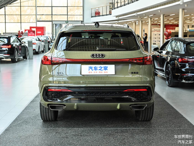 来到车尾,全新奥迪Q5L的设计同样亮点十足,最吸睛的就是它配备了第二代OLED光源贯穿式尾灯,点亮后带来更强的视觉效果和辨识度。后包围部分还加入了宽大的熏黑饰板,内部的蜂窝状结构也与前包围形成呼应,排气则采用了双边共两出布局,配合车顶的大尺寸扰流板,进一步凸显运动氛围。