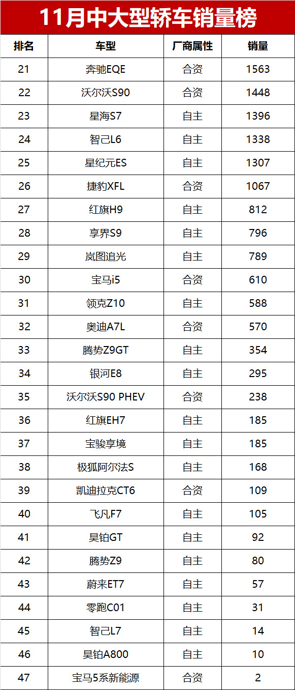 具体来看,11月销量能突破5000辆大关的中大型轿车有8款。其中传统合资豪华品牌占了3款,自主品牌占了5款,自主品牌在数量上已经占据了优势。