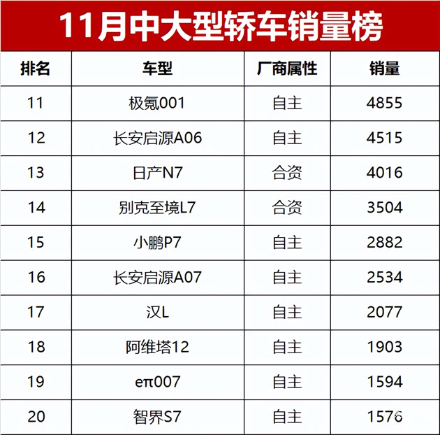 【2025年11月中大型轿车销量榜】到了11月,车市这股“冷风”算是吹遍了各个角落。乘联会的数据明明白白:整个轿车市场销量同比跌了10%,只卖了100.7万辆。大盘子缩水,各个级别的竞争都像拧紧了发条。在中大型轿车这个最能体现品牌“面子”和“里子”的战场,11月的销量榜透出的信息格外有意思:传统豪华“三巨头”的格局依然稳固,但内部的排位赛从未停歇;以小米SU7为代表的新势力“鲶鱼”,已经在这个市场站稳了脚跟,甚至能跟传统豪强掰掰手腕;而自主品牌的高端化之路,则呈现出几家欢喜几家愁的复杂图景。