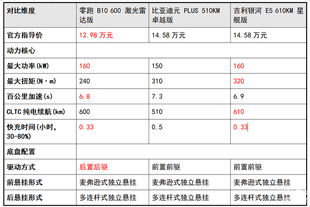 吉利银河 E5 610KM 星舰版 和比亚迪元 PLUS 510KM 卓越版均采用前置前驱的动力方案和前麦弗逊 + 后多连杆悬挂的底盘结构,不过在动力参数上与零跑 B10 有所不同。线下体验下来,这三款车都符合这个价位对于动力和底盘的要求,起码足够舒服,超车也足够轻松。毕竟日常家用,6-7 秒的零百加速已经完全够用了。