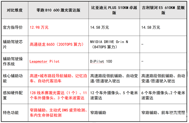 零跑 B10 600 激光雷达版 相比于吉利银河 E5 610 KM 星舰版 和比亚迪元 PLUS 510KM 卓越版,优势明显突出不少。硬件部分,零跑 B10 600 激光雷达版搭载了禾赛科技 128 线激光雷达和高通骁龙 8650 驾驶辅助芯片,可支持高速领航、城市领航及自动泊车辅助等功能。