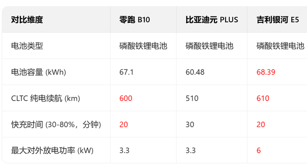 三款车均采用磷酸铁锂电池。其中零跑 B10 采用 67.1 千瓦时电池,CLTC 纯电续航可达 600公里; 比亚迪元PLUS 为 60.48千瓦时电池,CLTC 纯电续航510 公里;吉利银河E5为 68.39千瓦时电池,CLTC 纯电续航 610 公里。在充电的部分,这三款车都是支持快充的,基本能在 30 分钟左右充满,不过只是时间上有所不同。其中零跑 B10和吉利银河E5充满只需要20分钟,相比之下,比亚迪元PLUS 需要 30 分钟,零跑 B10和吉利银河E5 在充电的效率上还是要强上不少。
